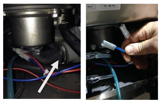 - Refit it to the elbow inside the machine, tighten the jubilee clip, and reconnect the wires to the back.